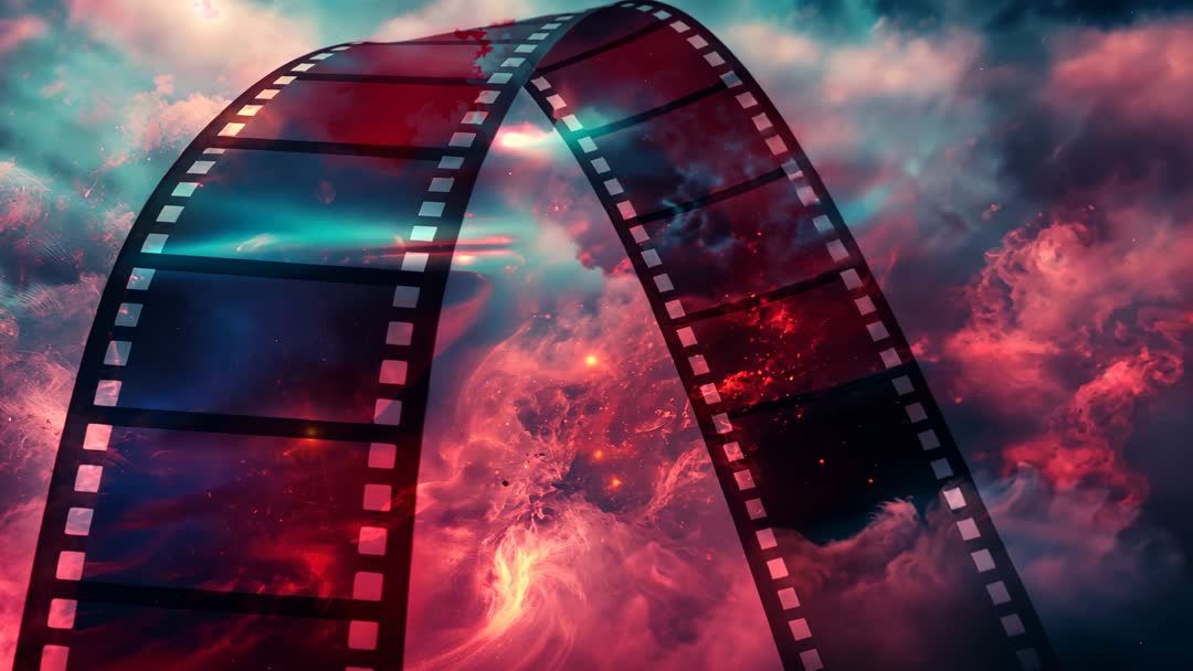 AI Generated Image. Film strips uniquely arch through an ethereal galaxy with vibrant magenta and teal clouds, suggesting a cosmic journey. Feelings of dynamism and futurism emerge as turquoise streaks add contrast to the scene. This abstract composition suits creative projects needing a modern cinematic theme, film industry promotions, or inspiring themes about universe exploration.