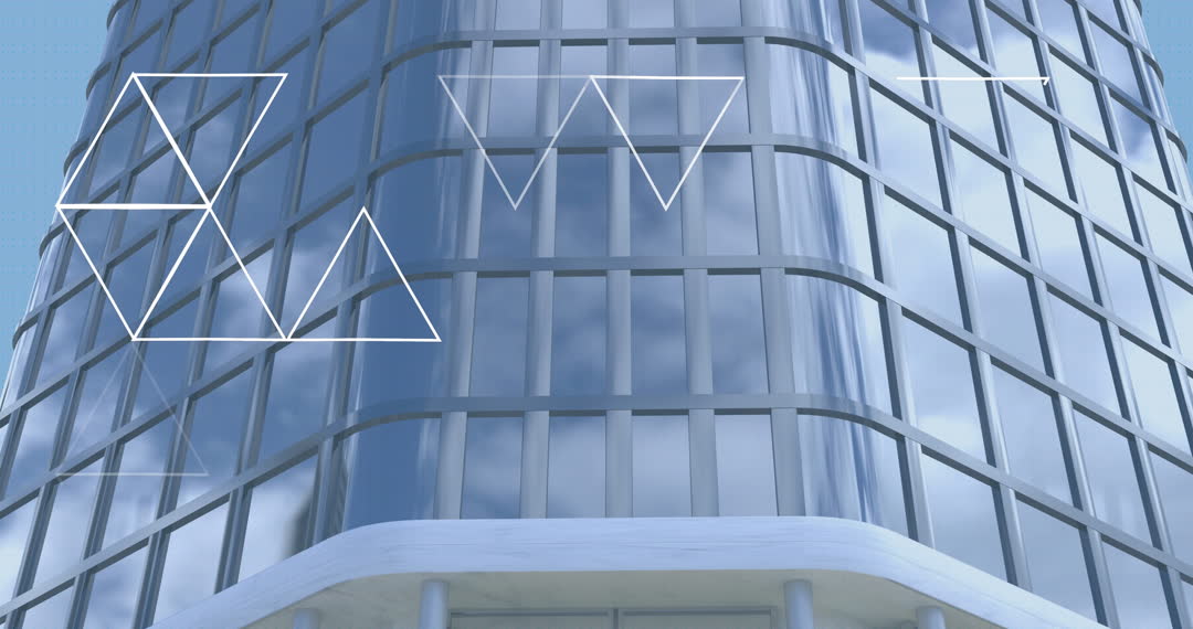 Features white geometric shapes over futuristic, metallic building with glass facade. This abstract composition evokes themes of technology, innovation, and modern architecture. Suitable for tech-themed presentations, design projects, or as a backdrop in talks about future trends and urban development.