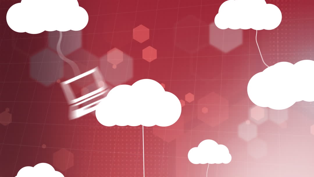 Animated representation of cloud computing icons moving on technologically themed red background abundant with hexagonal patterns. Ideal for illustrating concepts of digital technology, cloud storage innovations, or data interface designs used in technological presentations and web development visuals.