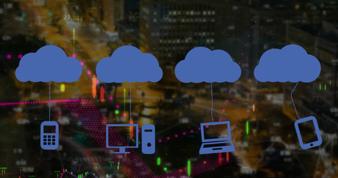 Visual illustration showing interconnected digital devices including phone, monitor, laptop, and smartphone symbolically linked to cloud storage in a stylized data-rich urban backdrop. Useful for representing concepts of modern digital connectivity, innovation in cloud technology, and urban technological development and integration narratives.