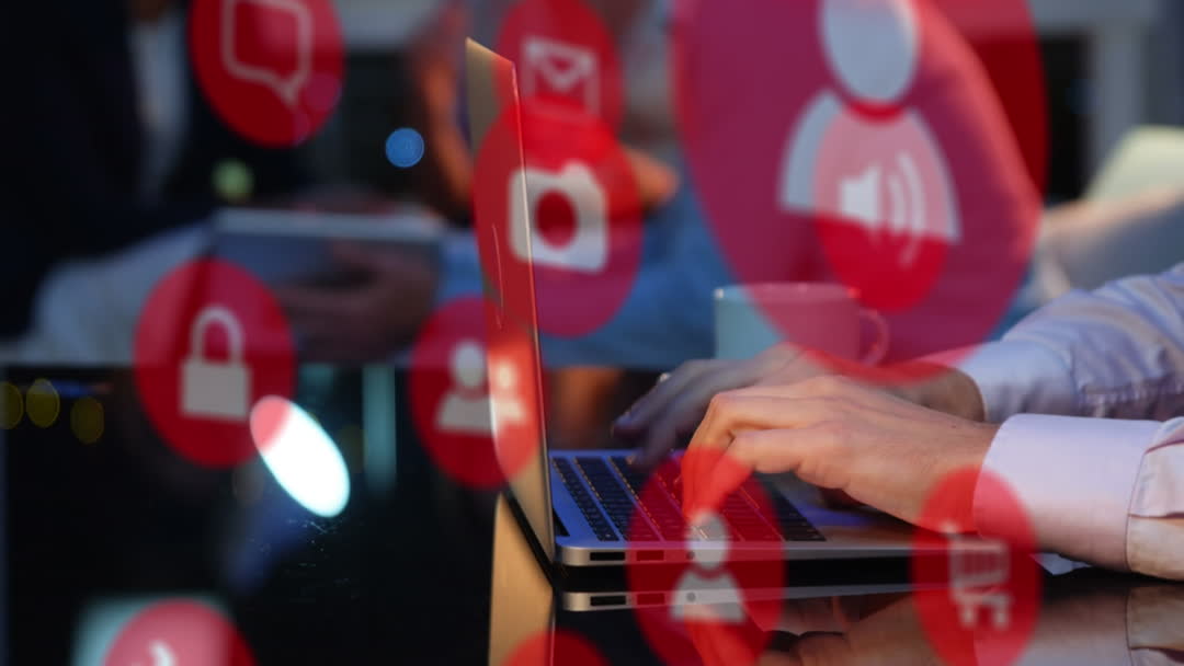 This visual conveys the dynamic interplay between digital communication and online connectivity through technology icon overlays. The hands typing on a laptop reference modern communication and the increasing dependency on digital platforms. Use in articles or content related to digital innovation, social networks, and tech-forward business solutions.