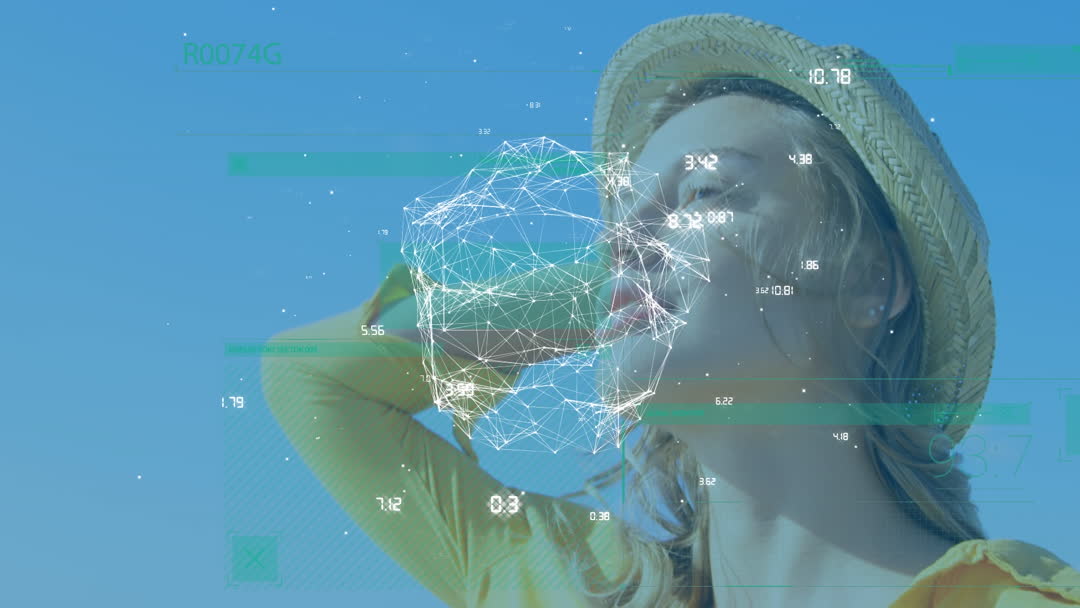 Illustration of a businesswoman with digital data and globe showcasing concepts of global connectivity and advanced communication technology. Great for use in technology, global communications, and digital networking promotions, as well as educational contexts involving tech illustration.