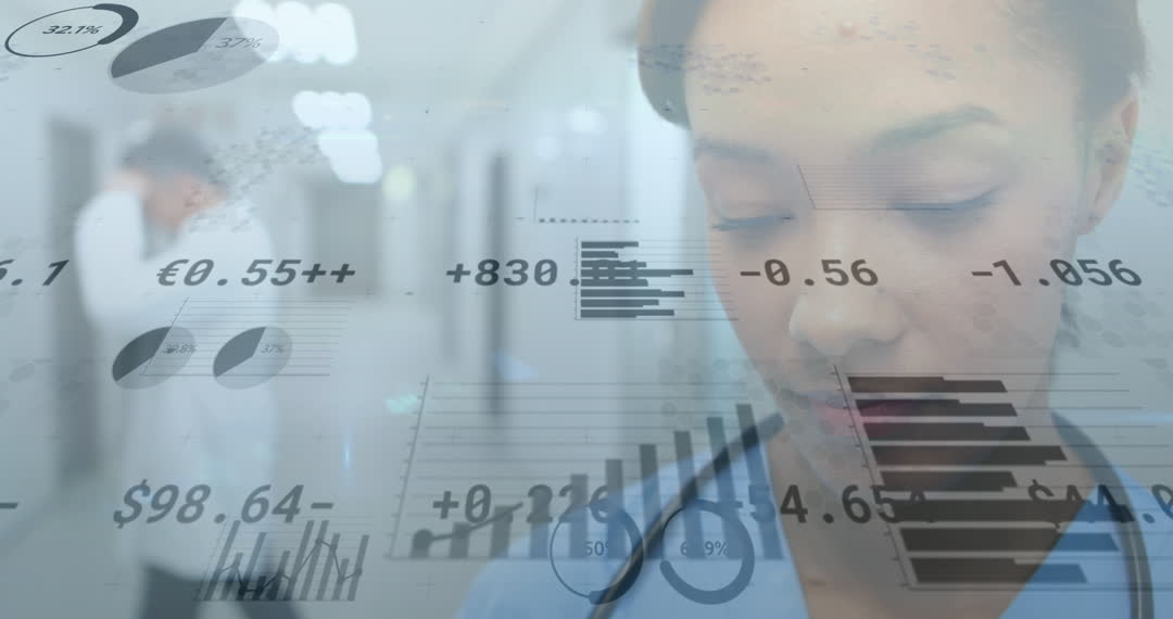 Visual overlay shows diverse medical and financial data along with focused healthcare professional. Represents integration between healthcare services and financial analysis. Useful for content on medical economics, healthcare digitization, or health data analysis advancements.
