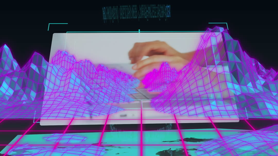 Depiction of metaverse concept showcasing digital data landscape surrounding computer screen with hands interacting. Neon colors suggest virtual reality and futuristic technology theme. Suitable for use in articles or presentations about technological advancement, virtual interactions, or the convergence of digital and physical worlds.