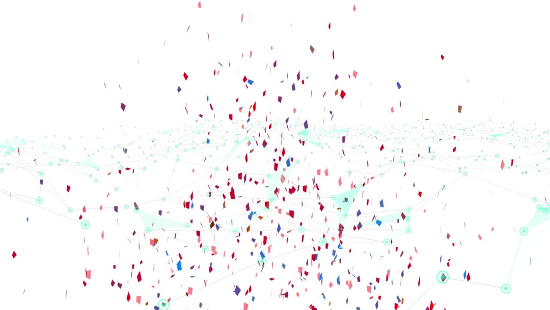Vibrant abstraction featuring confetti and geometric shapes floating on a white background. Ideal for use in digital art displays, technology presentations, or as a dynamic backdrop for creative projects or blogs exploring themes of connectivity and digital innovation.