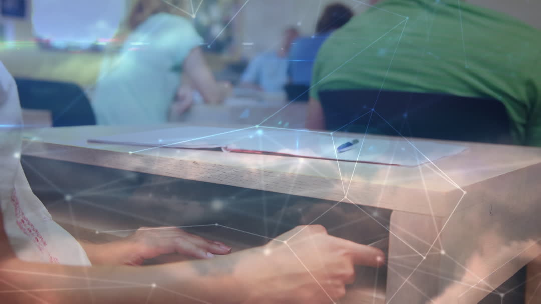Combination of educational technology with visualization of a connected network, depicting modern learning environments. Suitable for use in blogs or articles about digital transformation in education, technology-enhanced learning, and connectivity applications in academic settings.