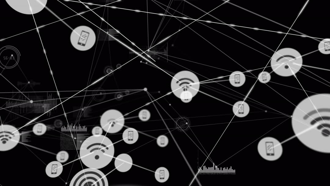 Abstract overlay combining network lines and digital symbols on black background. Depicts interconnected wireless signals and data elements, expressing a futuristic tech setting. Ideal for articles or presentations on networking technology, data communication, or digital animation's role in visualization. Useful for design work conservative tech-oriented visual themes.