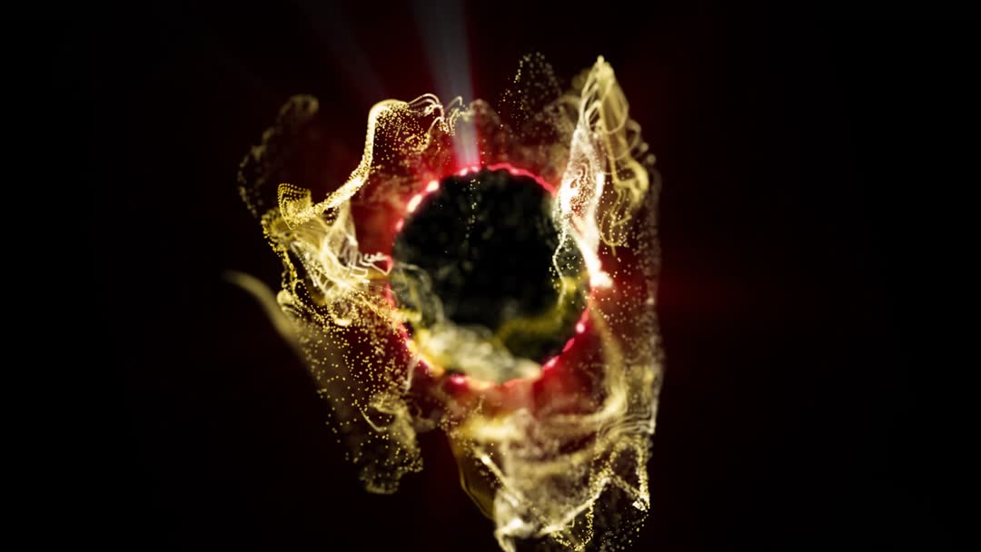 Abstract design featuring a central dark sphere enveloped in swirling golden particles and a vibrant red accommodating ring. Cosmic and futuristic vibe makes it suitable for digital art projects, backgrounds, digital marketing design, sci-fi-oriented material, and presentations emphasizing innovative technological advancements.