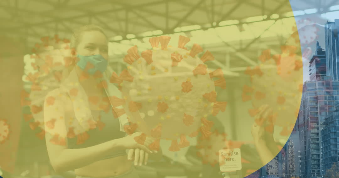 Digital animation illustrating diverse individuals and cityscapes interwoven with stylized virus cells and abstract shapes, conveying themes of global pandemic impact and unity. Ideal for projects about COVID-19 awareness, community health, and urban lifestyle adaptations.