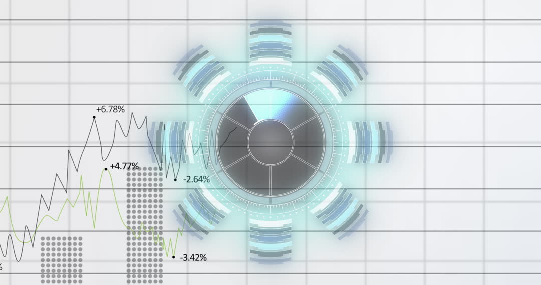 Stylized representation shows rotating gears with integrated graphs and statistics against a grid backdrop. Perfect for use in digital marketing, technology demos, data analysis presentations, and educational videos about network interfaces.