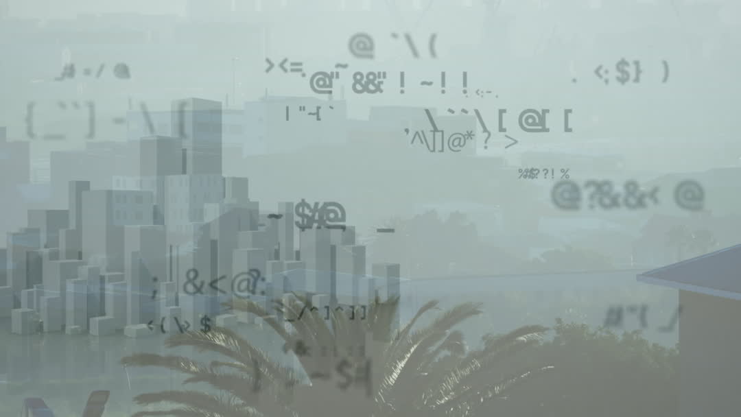 This abstract animation illustrates various elements of data and technology through code and symbol overlays on a cityscape background. Ideal for websites or presentations focusing on digital transformation, telecommunication development, or software innovation. Visualizes modern business solutions and the interconnected nature of global technology cultures.