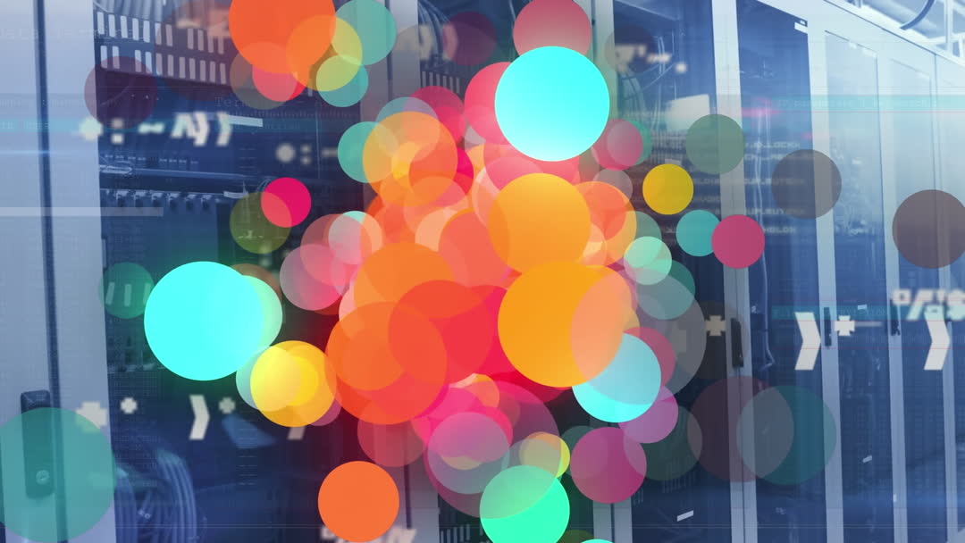 Dynamic visual representation of data processing show colorful spots overlaying a busy server room. Perfect for illustrating concepts related to technology, IT infrastructure, and digital innovation. Suited for use in tech presentations, digital design works, and educational materials on data management.