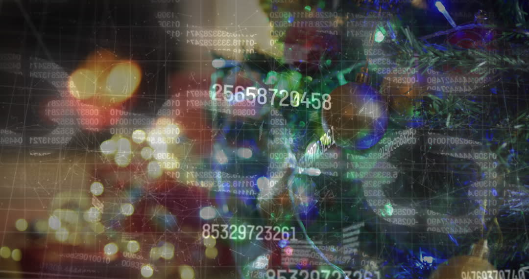 Abstract data overlay combined with festive Christmas tree lights, symbolizing collisions between technology and tradition. Ideal for concepts involving digital transformation during the holidays, festive technology themes, or illustrating data commerce. Useful for tech articles, digital holiday promotions, or academic presentations.