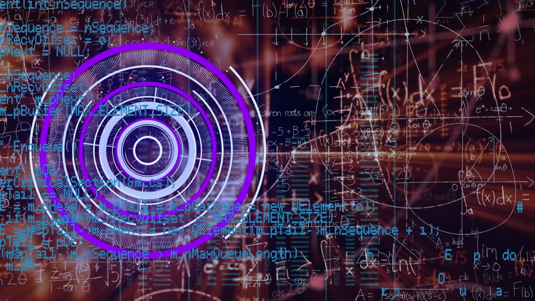 Conceptual representation of advanced technology with swirling neon scanner and mathematical equations. Suitable for use in presentations or articles on computer science innovations, data analysis techniques, and futuristic technologies.