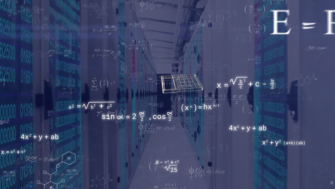 An animated visualization depicting layers of mathematical equations projected over a row of computer servers. Illustrates themes like digital data processing and advanced computing. Useful for backgrounds, presentations on technology, finance, or scientific research. Applied in contexts emphasizing innovation and dynamic thinking.