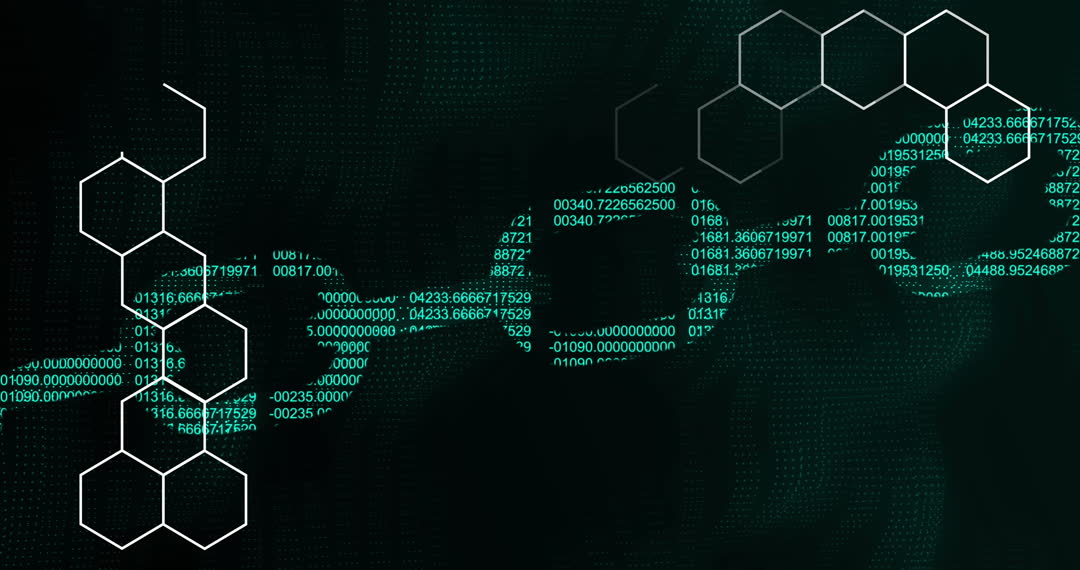 Futuristic visualization combines chemical formula elements and digital data processing against a dark backdrop resembling a digital interface. Ideal for technology presentations, science-related content marketing, and digital innovation themes, contributing towards modern educational materials or tech innovation articles.