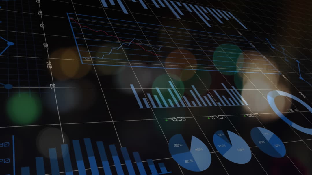 Depicts abstract digital data processing scene with colorful lights and graphical charts under black backdrop. Useful for business presentations, technology concepts, or backdrops for analytics-focused content. Highlights dynamic interface elements such as graphs and data charts in vibrant colors.
