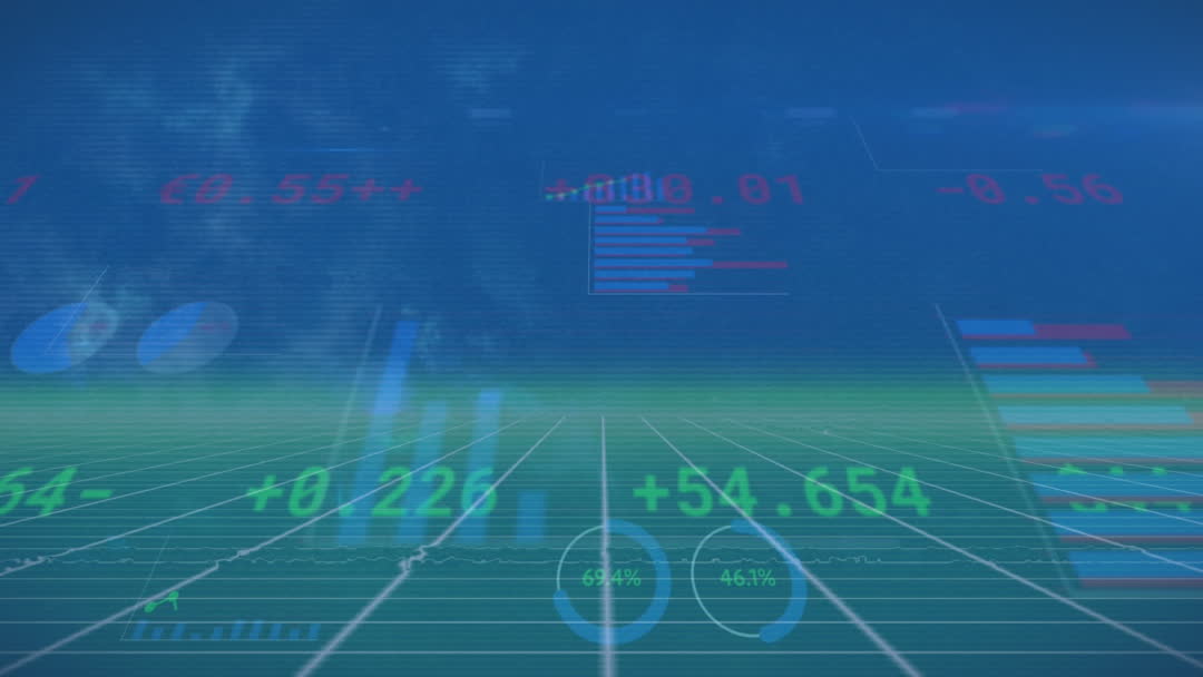 Dynamic representation of statistical data over an abstract green grid on a blue background, highlighting digital analysis and technology concepts. Useful for presentations, digital marketing, and educational purposes in the fields of finance and computer sciences.