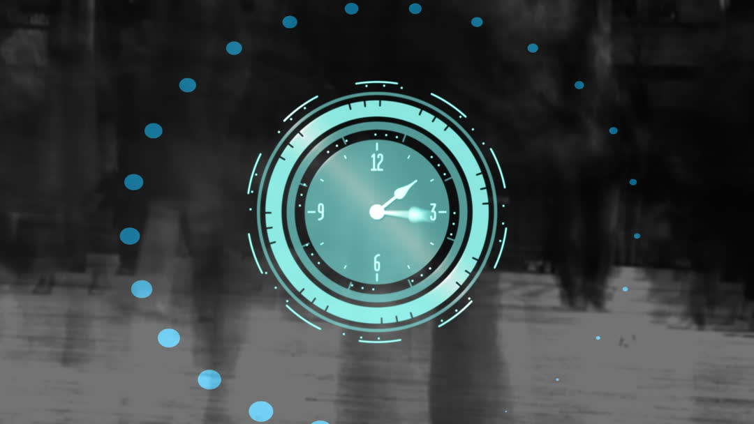 Digital clock with futuristic overlay hovering over blurred background featuring silhouettes of walking people. Suitable for illustrating concepts of time management, modern business, and global connection in marketing materials, presentations, or technology blog posts.