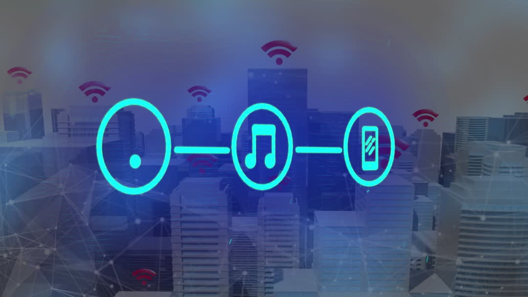 This conceptual illustration depicts glowing icons representing connectivity over a futuristic city skyline. The prominent use of digital icons such as communication through wifi, data exchange, and connectivity suggests themes of technology and modern urban living. Useful for technology presentations, smart city development projects, and articles on digital transformation.