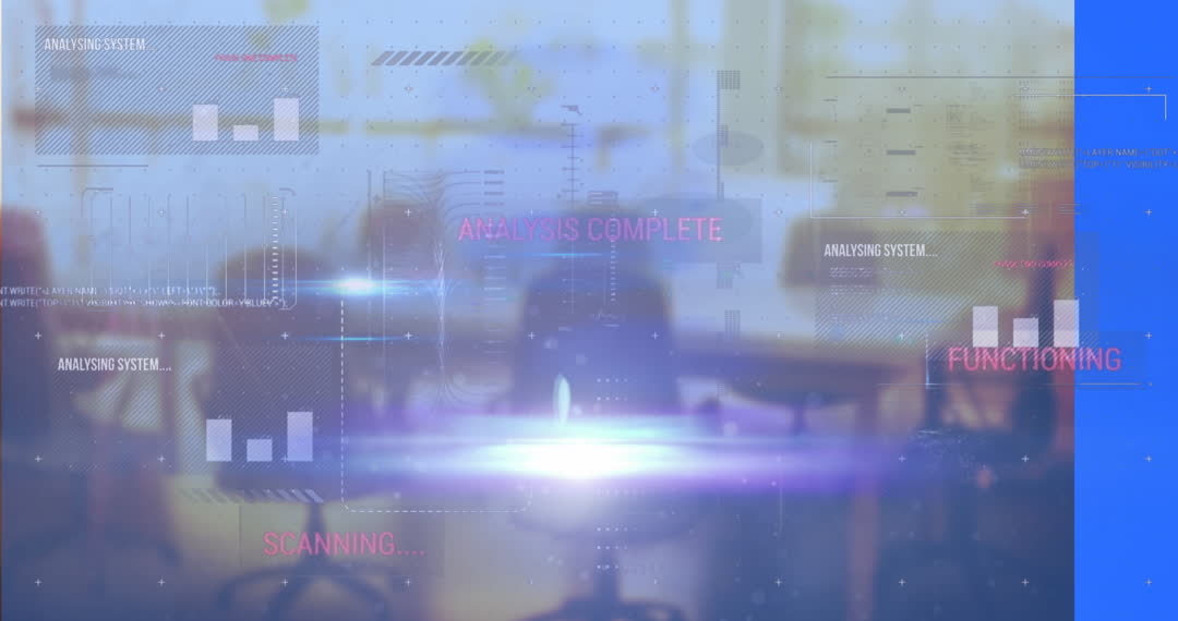 Digital display layered over a blurred office environment, showcasing elements of data analysis and processing with flowing light trails. Ideal for illustrating concepts around digital transformation, futuristic business technologies, or data-driven strategies.