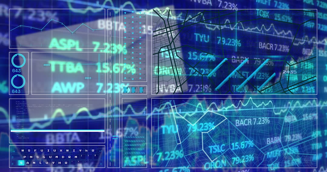 Animation showcases transparent screens with digital data and graphs. Great for illustrating concepts related to digital finance, stock trading advances, and futuristic technology interfaces. Useful for business presentations, financial technology articles, and educational resources focused on data analysis and artificial intelligence.