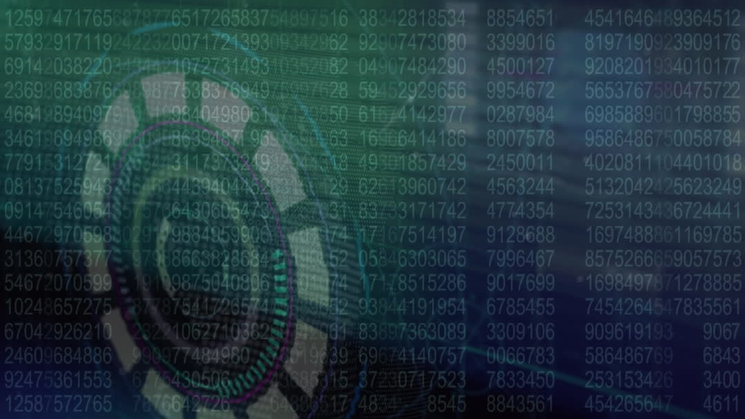 Abstract visualization combining digital elements and graphical data with numbers overlay. Incorporates technology theme for designs related to data analytics, cybersecurity, or digital solutions. Frequent uses can include backgrounds for websites or videos focused on advanced technology topics.