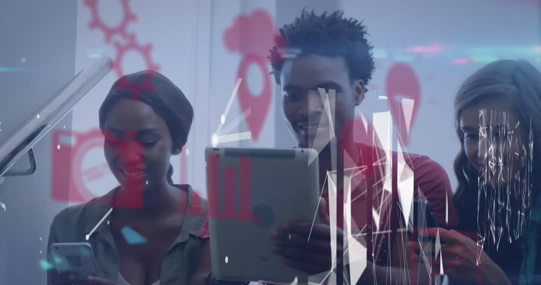Group of diverse individuals interact with digital devices, showcasing abstract data icons and technology interface. Useful for visualizing modern business solutions, teamwork dynamics, and digital transformation strategies in multinational companies.
