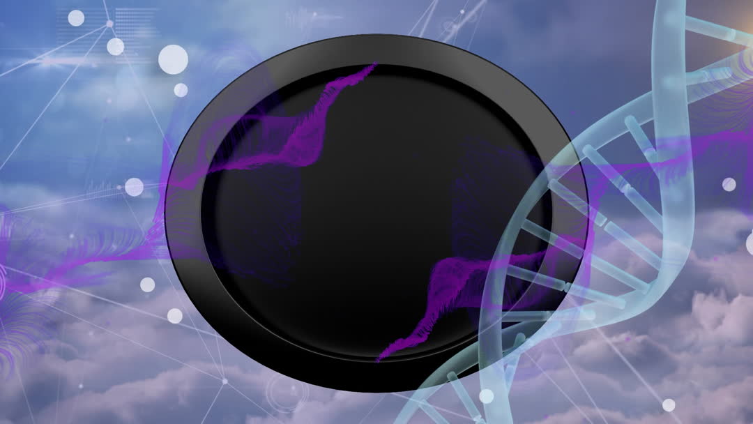 This visual showcases a digitally animated theme featuring DNA strands and circular space set against a backdrop of cloud motifs and centralized connectivity elements. Ideal for use in science and technology presentations, genetic studies material, video backdrops for innovative presentations, and content related to digital transformations and biotech explorations.