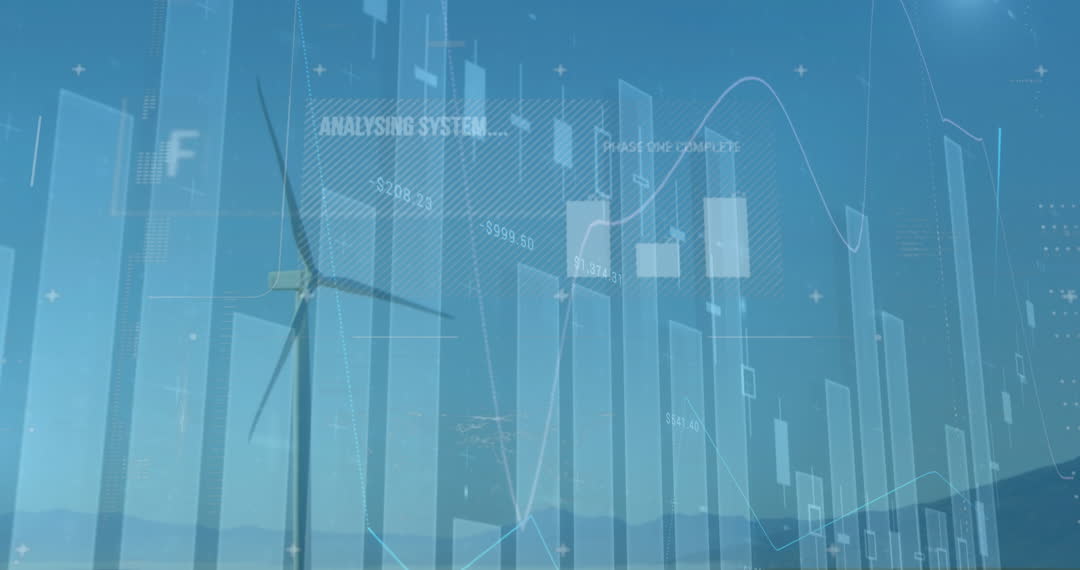 Visual representing the fusion of renewable energy and digital financial analysis. Overlaps wind turbine videory with animated financial data charts, symbolizing intersection of economic analysis with sustainable energy solutions. Ideal for content on investment in clean technology, future of renewable sectors, or modern financial analysis methods in tech-driven economies.