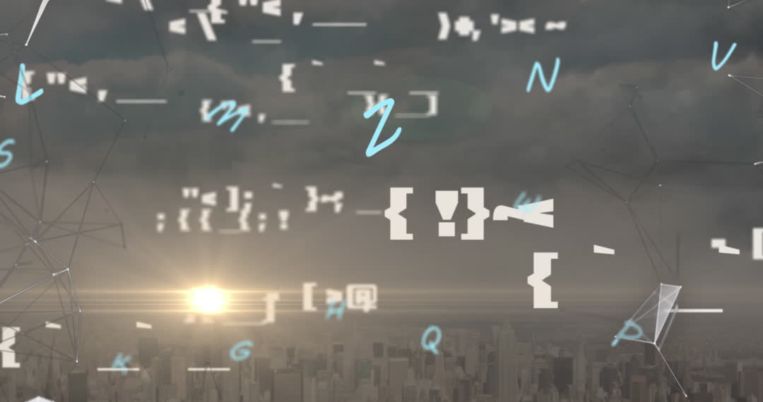 Image depicts statistical numbers and abstract elements processing over a dynamic city skyline, symbolizing global business and digital networks. This is ideal for illustrating financial reports, digital transformation, technological advancements, or urban interconnectedness themes.