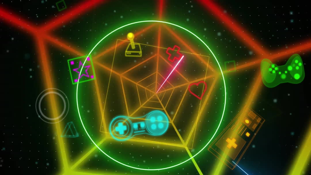 Vibrant animation of digital gaming theme with neon colors and a futuristic ambiance. Great for use in technology presentations, gaming blogs, digital networking promotions, creative tech and toy advertisements, or as a modern entertainment background.