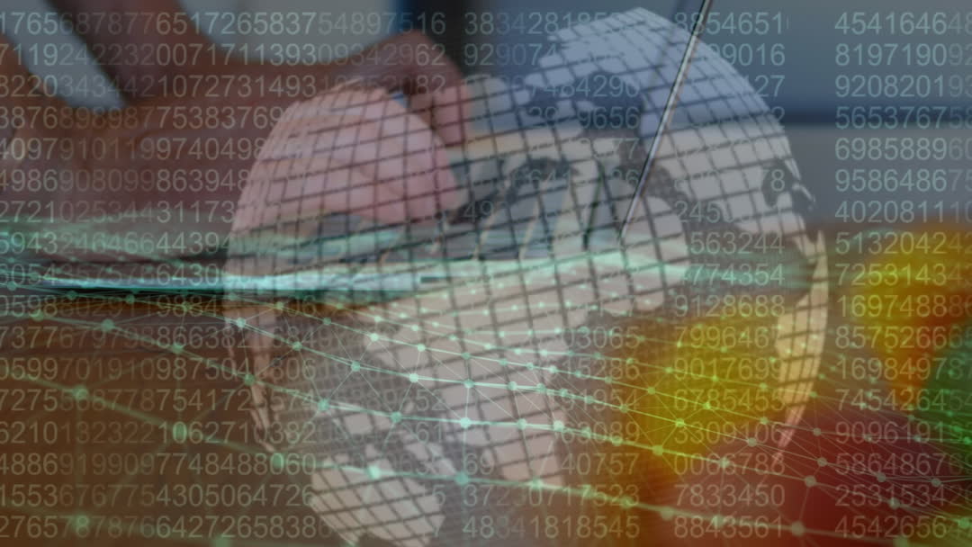 Abstract Digital Globe and Numeric Overlay on Laptop Typing Video
