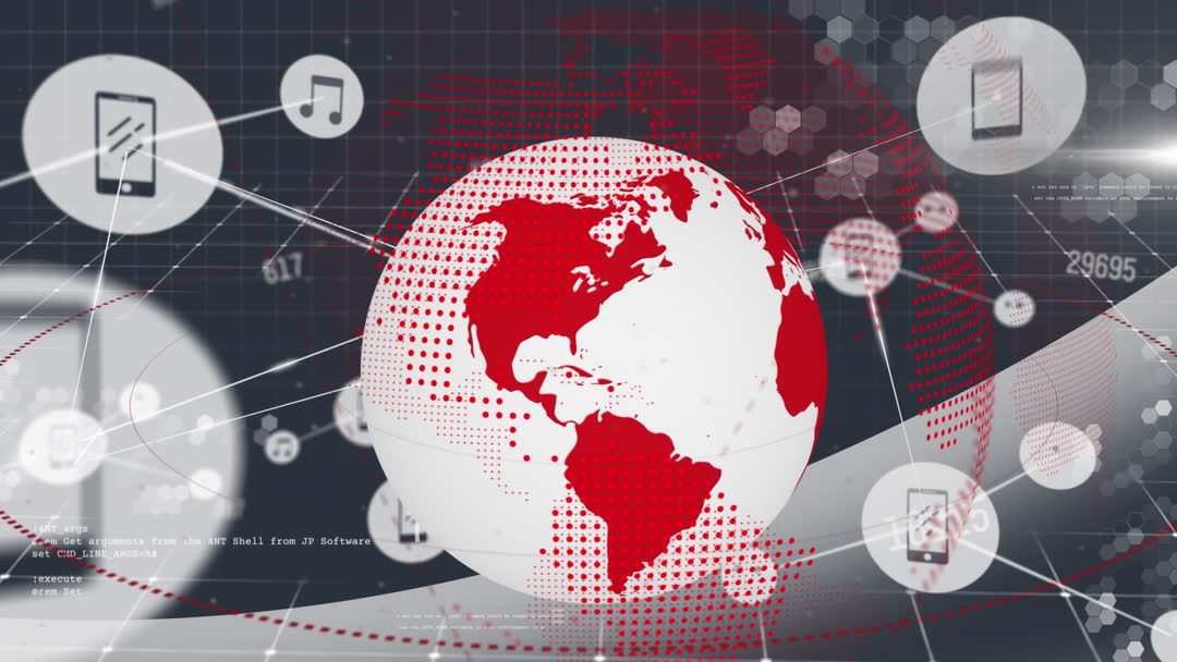 This video depicts an abstract red and white digital globe surrounded by network icons, representing global connectivity and technology. The dark background emphasizes data streaming and cyber communications, making it suitable for use in technology presentations, cybersecurity seminars, and global network marketing materials. It visually illustrates concepts of networking, digital communication, and data exchange.