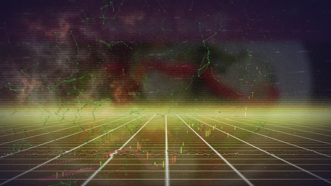 This graphic features an abstract digital interface with dynamic neon cloud patterns and grids. Ideal for use in technology and innovation presentations, the visual suggests futuristic themes and digital connectivity. Perfect for backgrounds in webinars or conference streams.