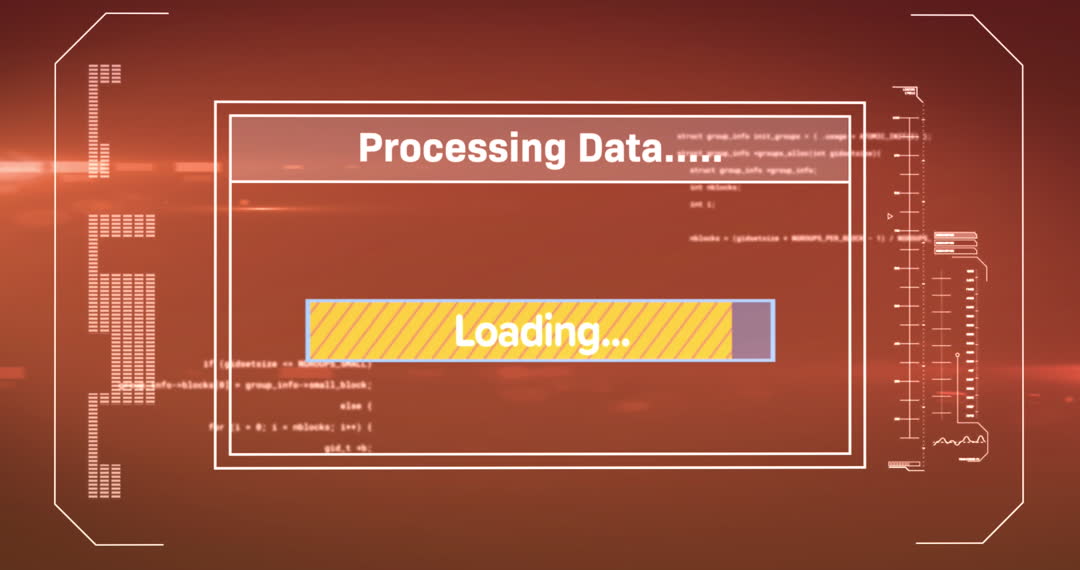 This visual features a futuristic digital interface with a focus on loading data, set against a vibrant red background with techno elements. Use this animation as a concept visual in presentations or videos about technological advancements, data management, or computer systems.