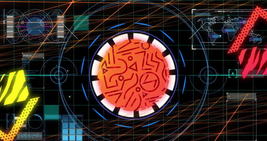 This vibrant animation depicts an abstract digital interface featuring animated elements that showcase data scanning. Colorful grid lines, geometric patterns, and a digital map provide a futuristic atmosphere suitable for technology-related themes. Use in digital presentations, websites, or advertising related to global business and technology innovations.
