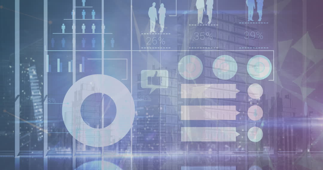 This abstract design features a digital interface showcasing data processing with various graphs and statistical elements. It is ideal for representing global business concepts, technological advancements, and data analysis themes. Perfect for use in presentations, finance and business-related content, and technology feature articles.
