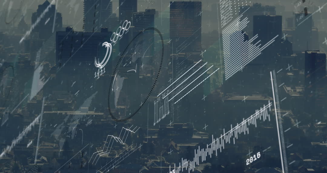 Abstract digital graphics over urban cityscape embody interactive data connectivity and technology themes. Suitable for use in tech environment promotions, digital economy concepts, market trends illustrations, financial analytics showcases, or infographics depicting global connectivity.