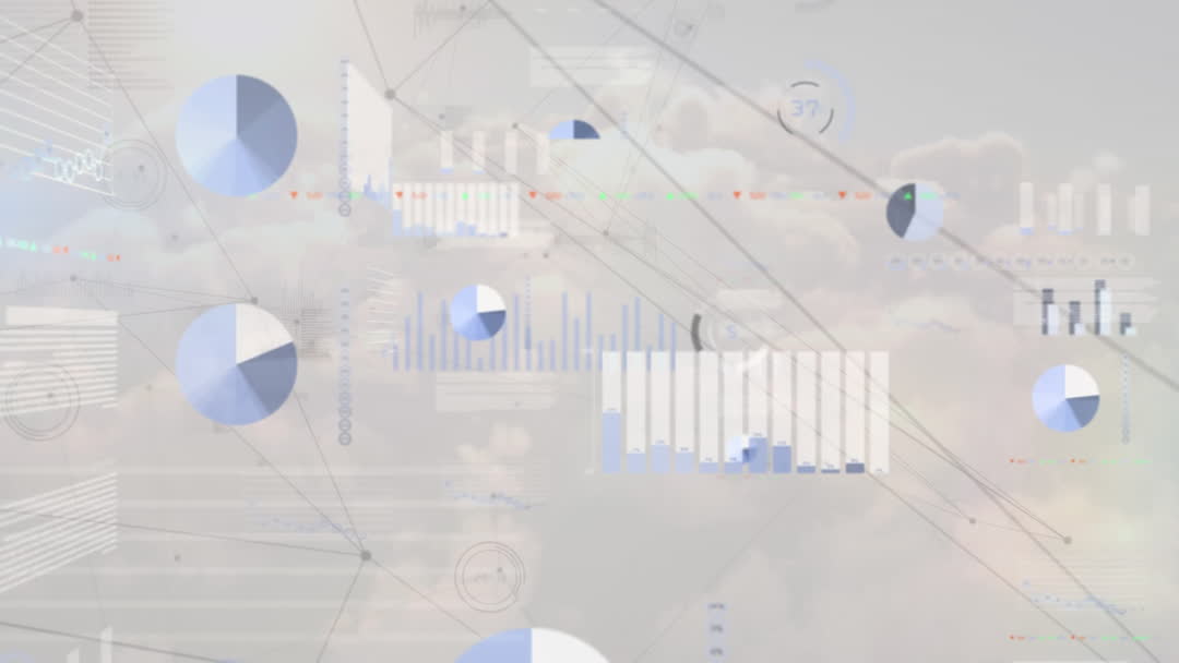 Digital design visualizes a seamless interface where abstract charts and graphs levitate against cloud-like elements. Graphic elements showcase trends and analytics frameworks, representing modern networking and technological integration. Ideal for use in presentations on innovation, global business strategies, data analysis seminars, or IT workflows.