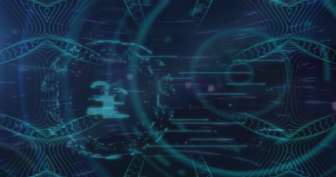 Digital interface displays abstract shapes and a padlock icon, representative of technology and security themes. Futuristic and global computing concepts illustrated in dynamic motion. Suitable for use in presentations, tech industry content, or cybersecurity articles.