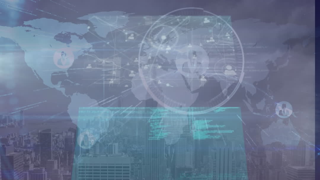 Cityscape features superimposed digital graphics, including a world map and technology interface, conveying a concept of global connectivity and technological growth. Ideal for themes relating to futuristic cities, data analytics, business innovations, or information technology.