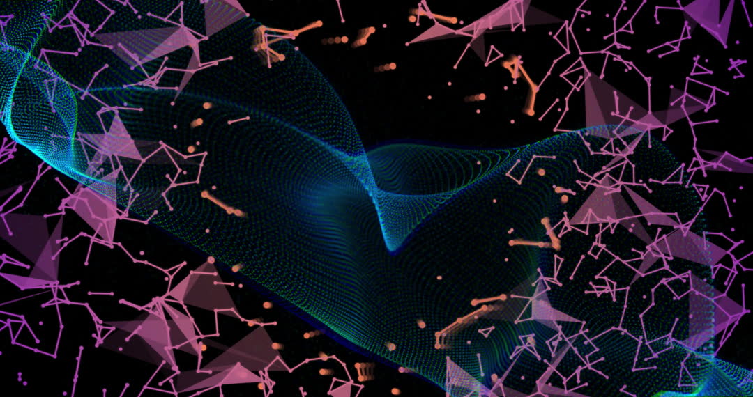 Dynamic digital motion art with swirling light trails and data patterns on a black background. The composition evokes themes of connectivity, technology, and data processing. Suitable for use in backgrounds for tech presentations, digital marketing, and concept illustrations for innovation and future-oriented topics.