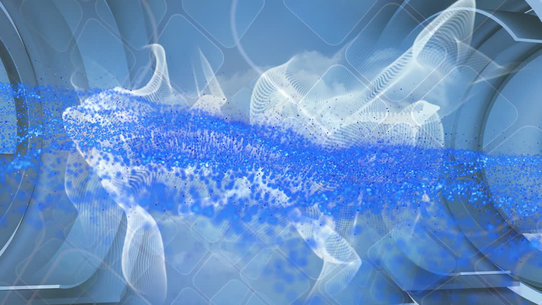 This abstract animation showcases moving shapes and a dynamic stream of blue spots, accented by white wave-like structures. The futuristic theme lends itself to various uses in digital marketing materials, creative artwork, technology presentations, and conceptual backgrounds. This vibrant scene visually captures the idea of innovation and flow in a digital age, making it ideal for projects seeking a modern, high-tech aesthetic.