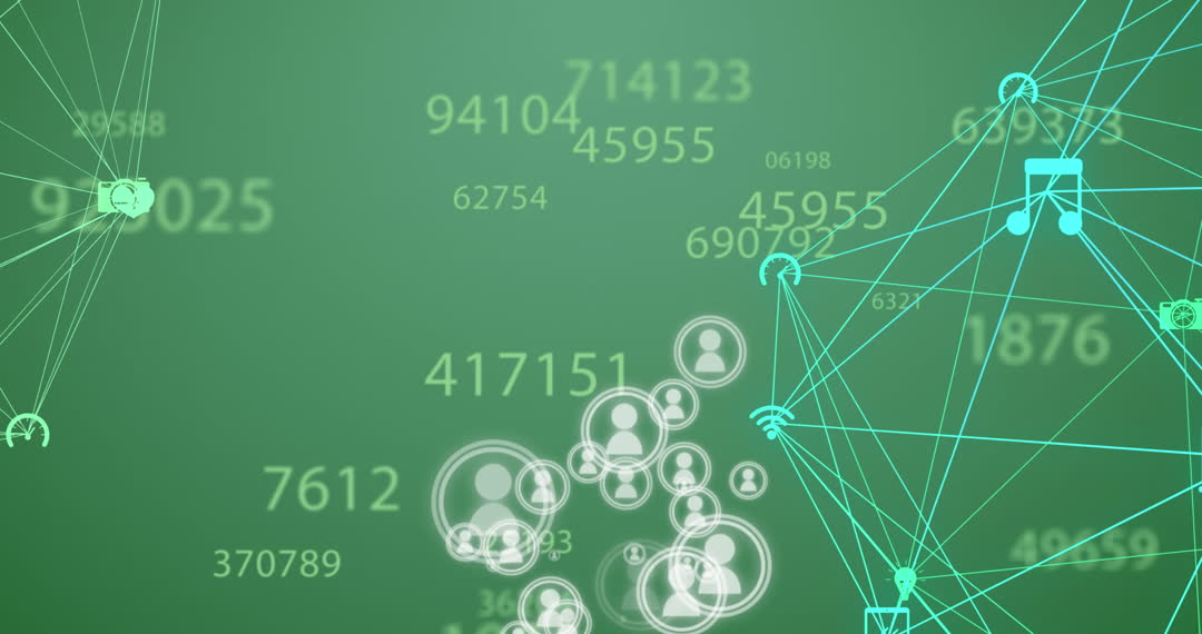 This illustration features a green background with floating numbers and network lines, including technology icons such as profiles and music notes. Useful for illustrating concepts related to global communication, technology networking, or data management. Ideal for digital strategy presentations, tech article visuals, and online platform banners.