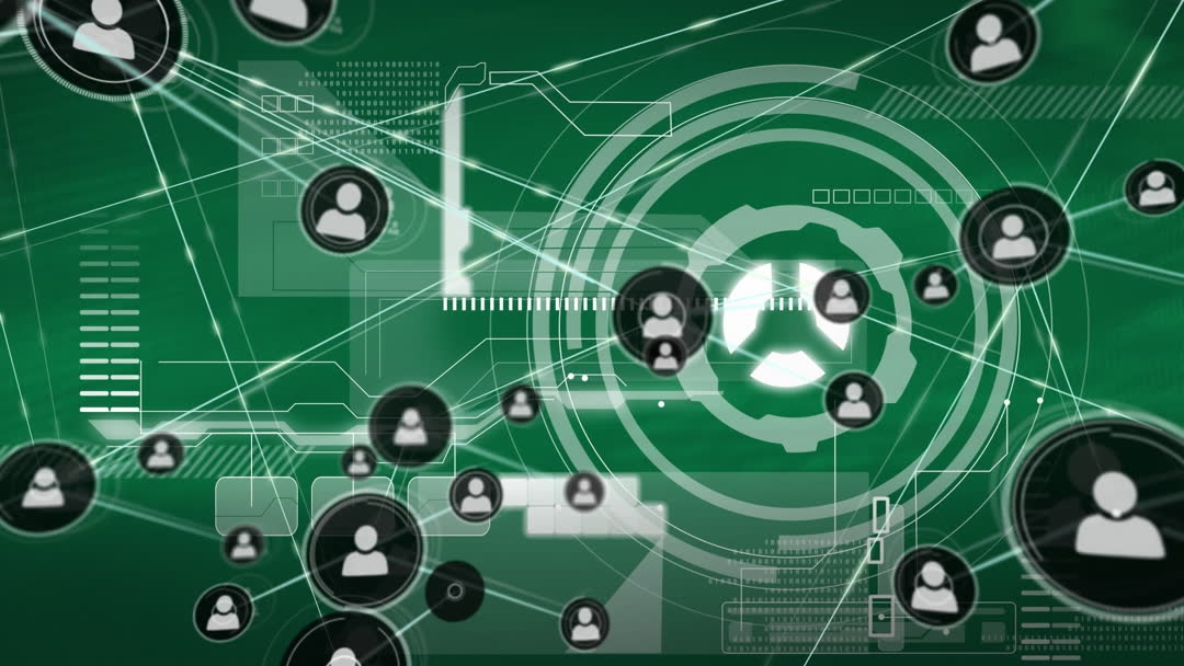 Green thematic animation depicting digital network concepts with interconnected nodes and data processing elements. Useful for technology and communications themes, virtual network graphics, cybersecurity topics, digital innovation presentations, or websites depicting online connectivity systems.