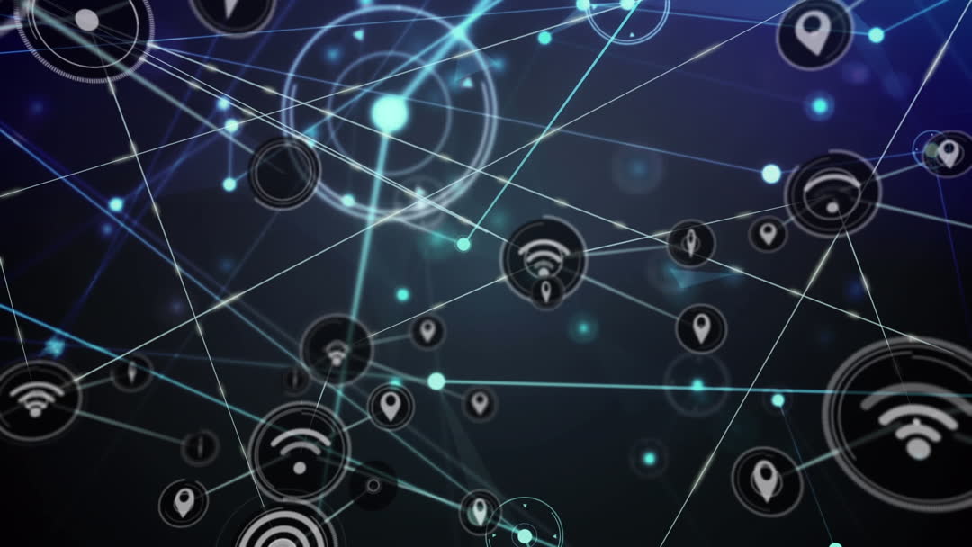 Animated depiction of interconnected digital systems with various icons, including Wi-Fi and location symbols. Illustrates the concept of global communication, internet technology, or data exchange. Useful for technology presentations, telecommunication concepts, or digital marketing visuals to demonstrate complex network systems.