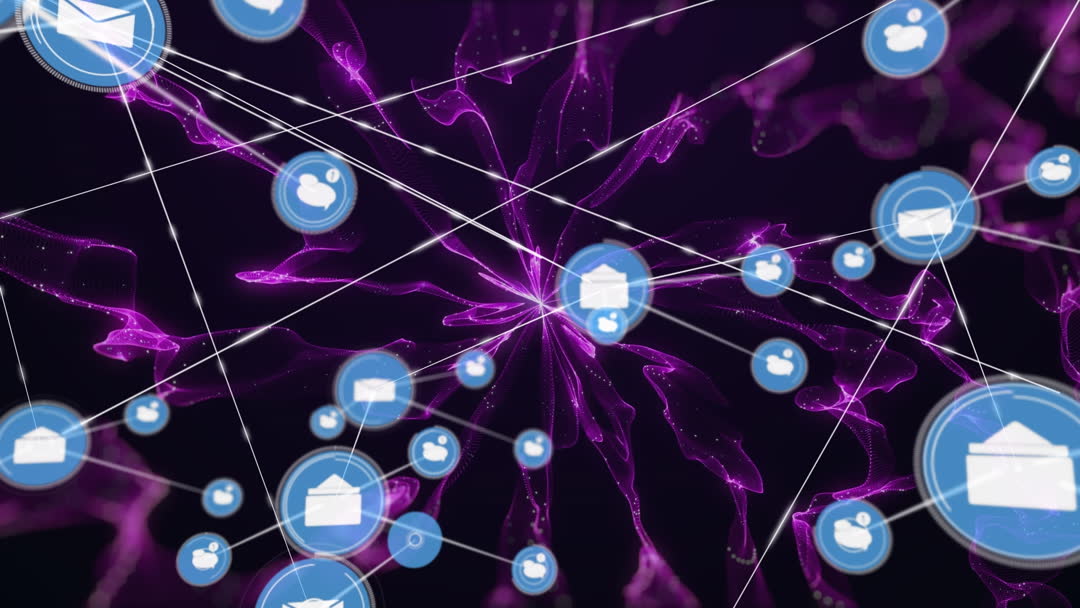 Abstract illustration depicts interconnected digital symbols over vibrant purple energy pattern on dark backdrop, symbolizing modern communication and data networks. Ideal for use in presentations, technology websites, advertisements, and media related to connectivity and digital transformation.