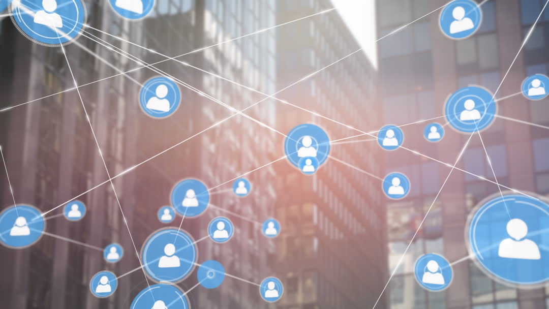 Overlay of digital profile icons interconnected with lines appearing amid modern skyscrapers, illustrating global communication and technological networking. Ideal for showcasing concepts of business efficiency, corporate networking, and digital transformation in urban environments.