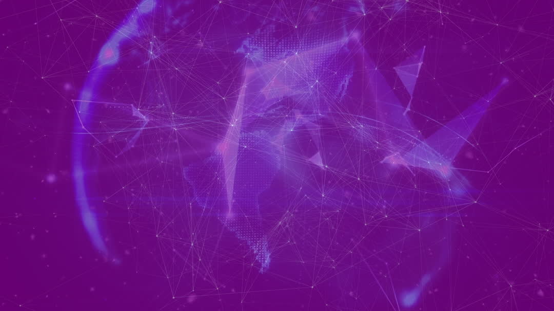 Visual depicting abstract digital network overlaying stylized globe in vibrant purple hues, embodying concepts of global communication and data exchange. Ideal for illustrating technological advances, scientific ideas, or computing themes in presentations, promotional materials, or content associated with digital innovation and networks.